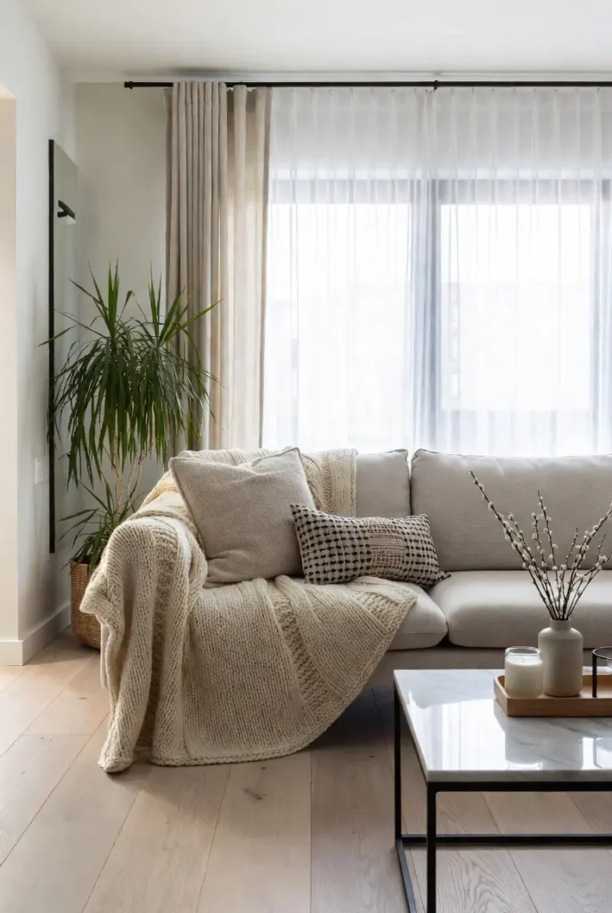 Modern interiors sometimes risk feeling cold. Soft layers like throws, cushions, and rugs add warmth and make the room feel lived-in.