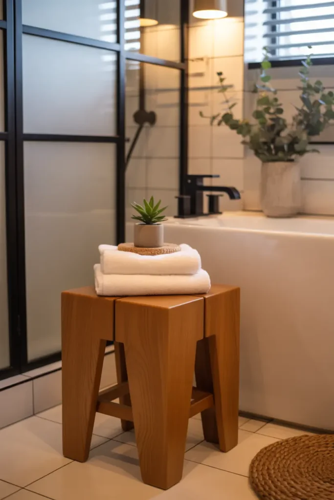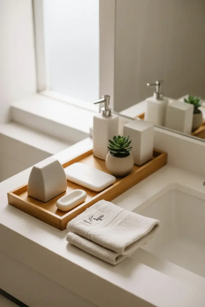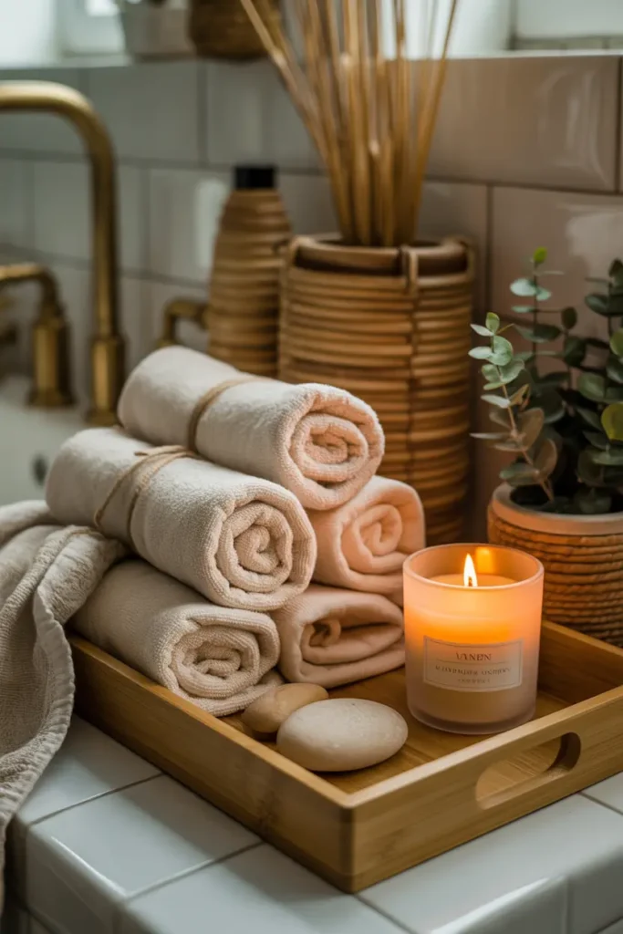 Instead of trying to decorate your entire bathroom at once, start small. Choose one corner and give it a purpose—roll a few soft towels, place them on a wooden tray, and maybe add a candle or decor piece.