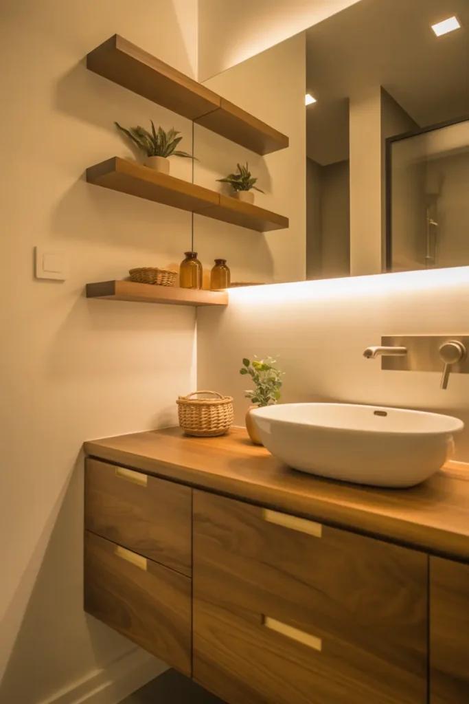 Bathrooms often feel cold due to tiles and metal elements. Introducing wood—whether through shelves, vanities, or small decor—adds warmth and balance.