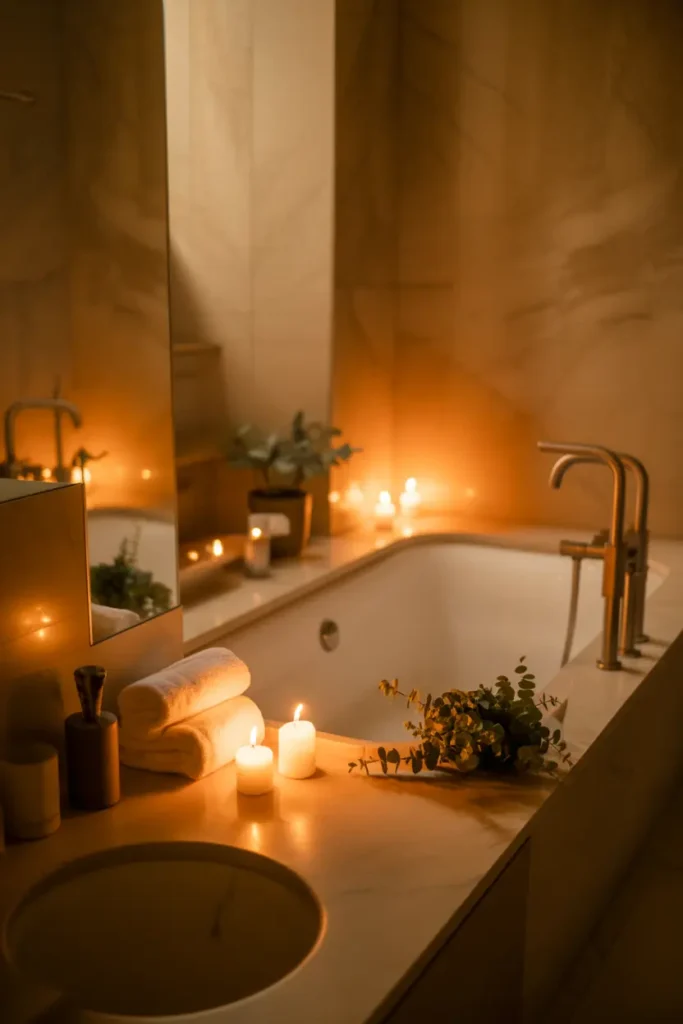 That’s usually because of lighting. Switching to soft, warm lighting or layering different light sources creates a relaxing, spa-like environment.