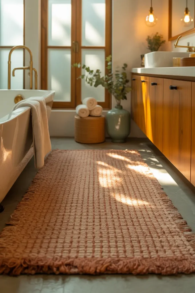 Flat surfaces can make your bathroom feel dull. Adding a textured rug introduces depth and comfort, making the space feel more inviting.