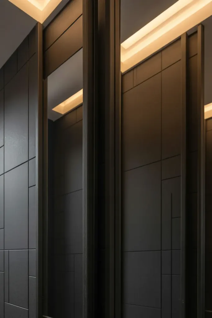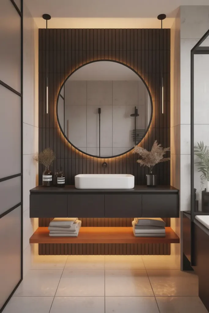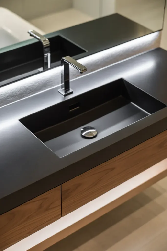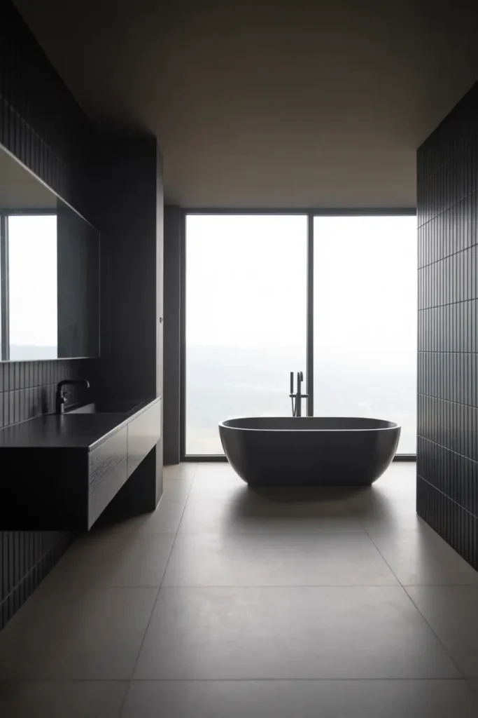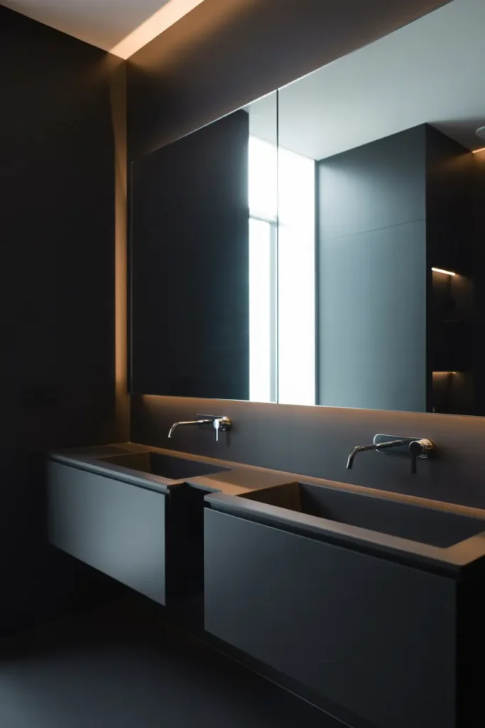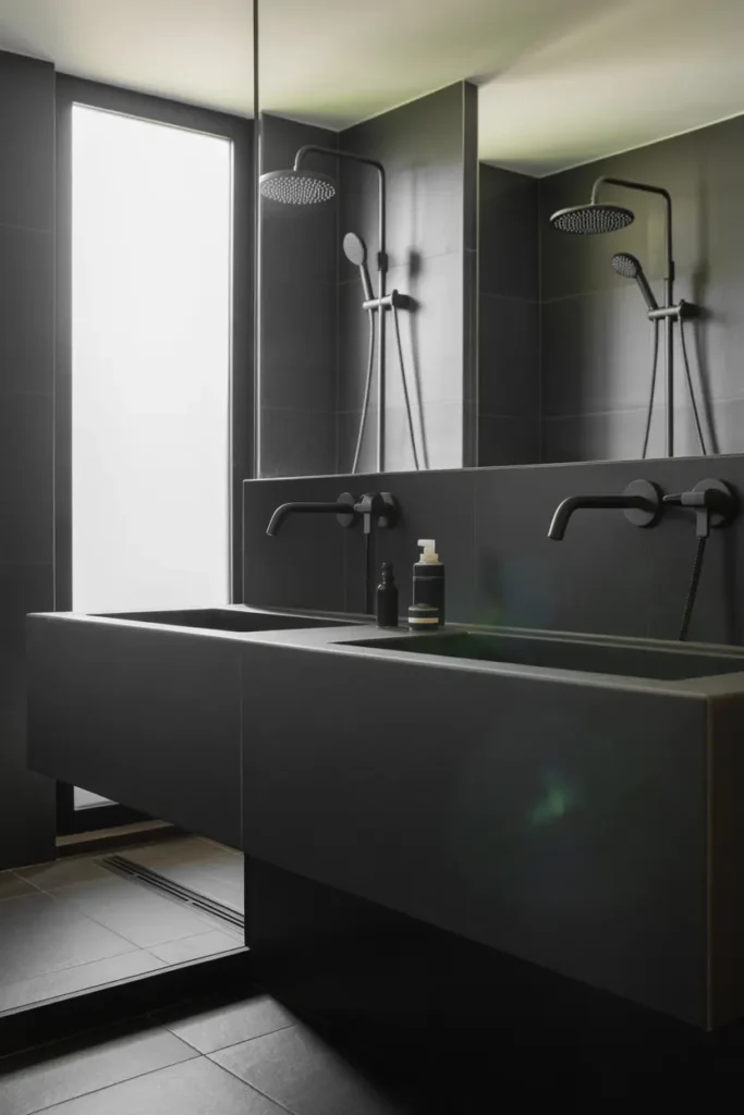 A matte black feature wall instantly sets the tone for a bold and luxurious bathroom. Unlike glossy finishes, matte textures absorb light and create a soft, velvety depth that feels modern and refined. Placing this wall behind the vanity or bathtub allows it to act as a strong focal point without overwhelming the entire room. When balanced with lighter elements like white sinks or soft lighting, the result feels both dramatic and beautifully controlled.