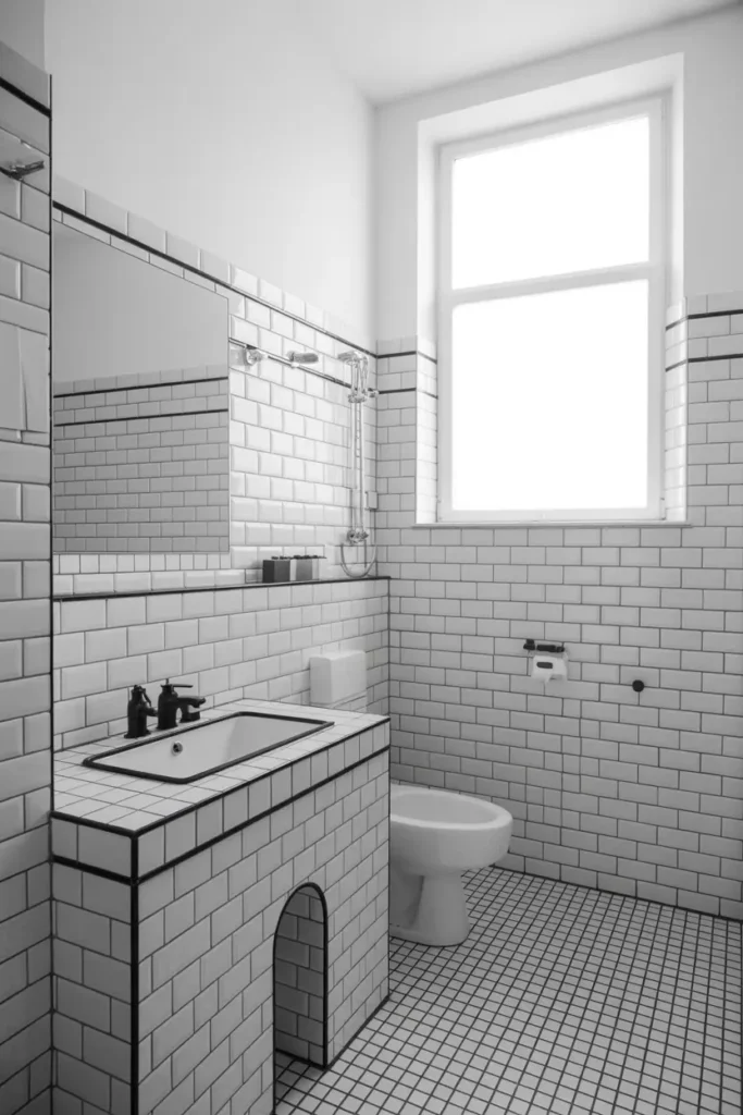 The black-and-white combination is one of the most timeless design choices you can make. Black adds boldness, while white keeps the space feeling bright and clean. This contrast works especially well in smaller bathrooms, where maintaining light is important. Using white tiles with black fixtures or a black vanity with white walls creates a balanced look that feels modern yet classic.