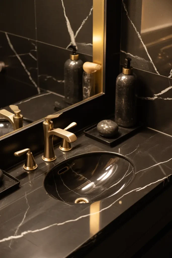 Black marble instantly brings a high-end feel into any bathroom. The natural veining adds movement and depth, preventing the space from looking flat or plain. Whether used on countertops, walls, or floors, marble creates a sophisticated look that feels both bold and refined. Pairing it with warm lighting enhances its natural beauty even further.