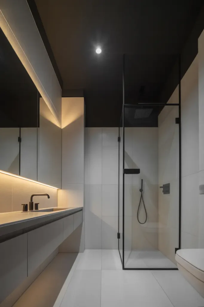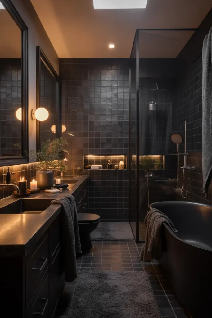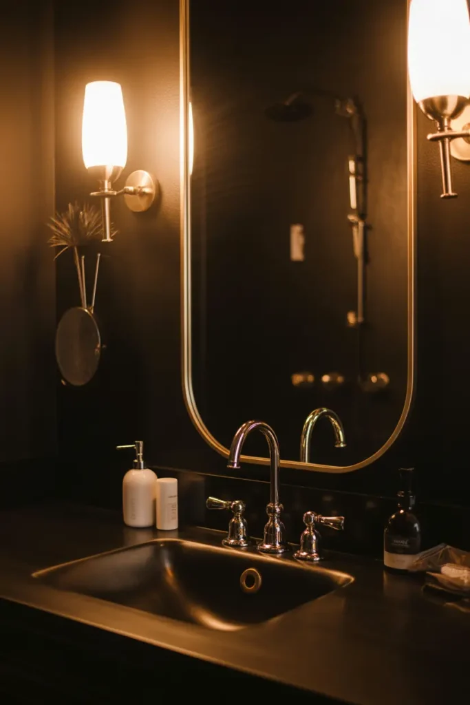Lighting is essential when working with darker colors. Warm lighting softens black tones and prevents the space from feeling cold or harsh. Layered lighting—such as wall sconces and ceiling lights—creates depth and highlights textures beautifully. This approach makes the bathroom feel cozy and welcoming.