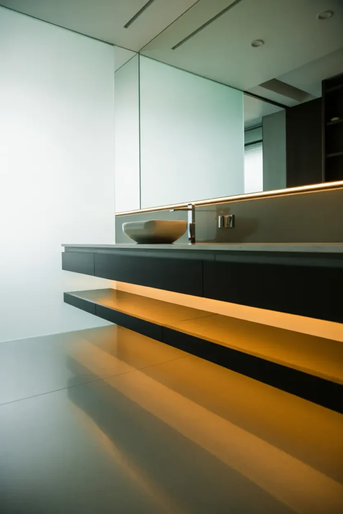 A floating vanity in black creates a clean and contemporary appearance. The open space underneath makes the room feel larger while maintaining a minimalist aesthetic. This idea works especially well in compact bathrooms where every inch matters.