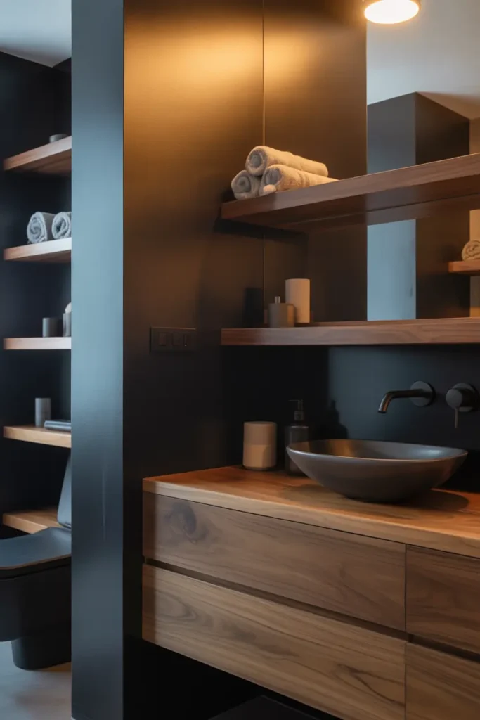 Mixing black with wood tones creates a beautiful balance between boldness and warmth. Wooden shelves or vanities soften the dark color and add a natural touch. This combination feels modern yet cozy, perfect for creating a relaxing bathroom environment.