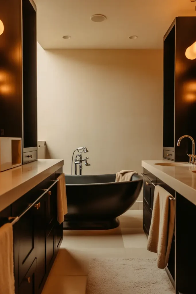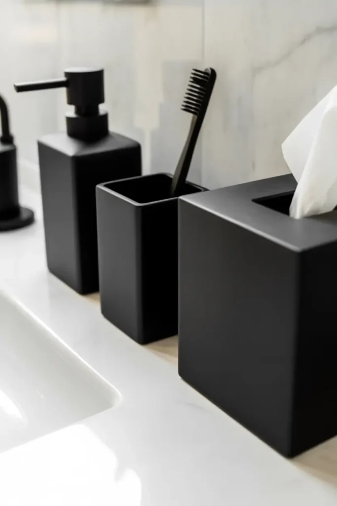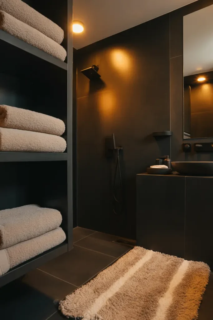 Soft elements like towels, rugs, and curtains help balance the strong presence of black. Choosing neutral or warm tones keeps the space feeling comfortable and inviting.