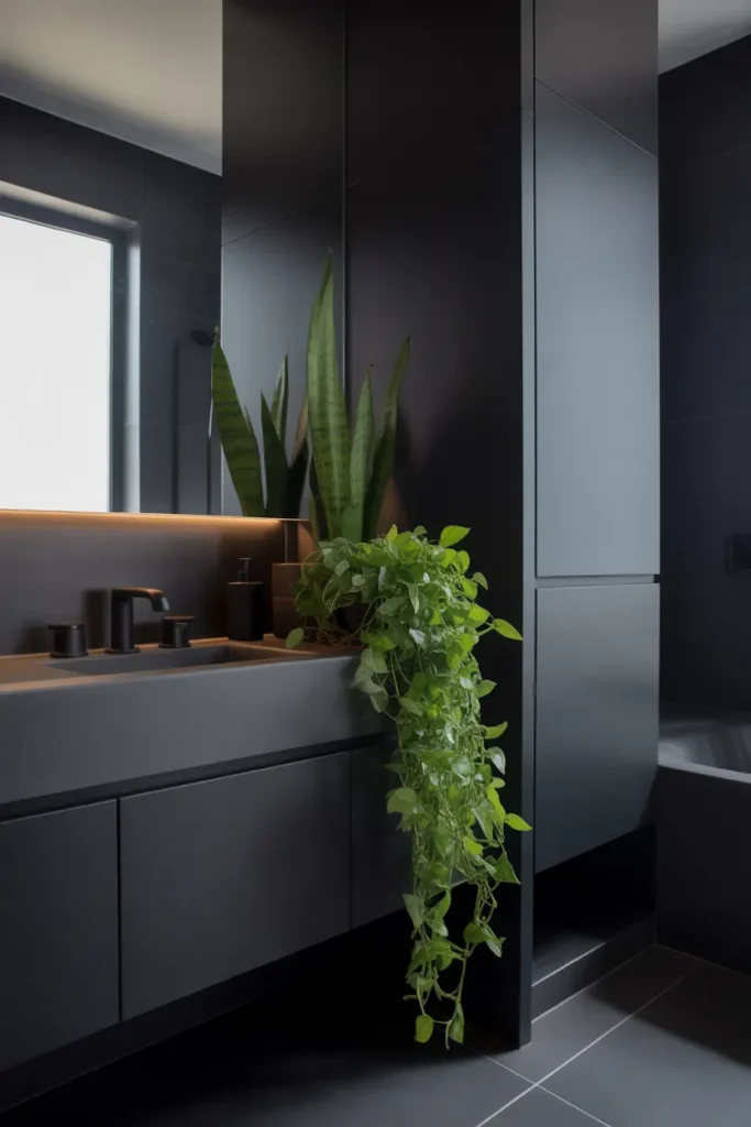Greenery adds life and freshness, balancing the darkness of black interiors.
