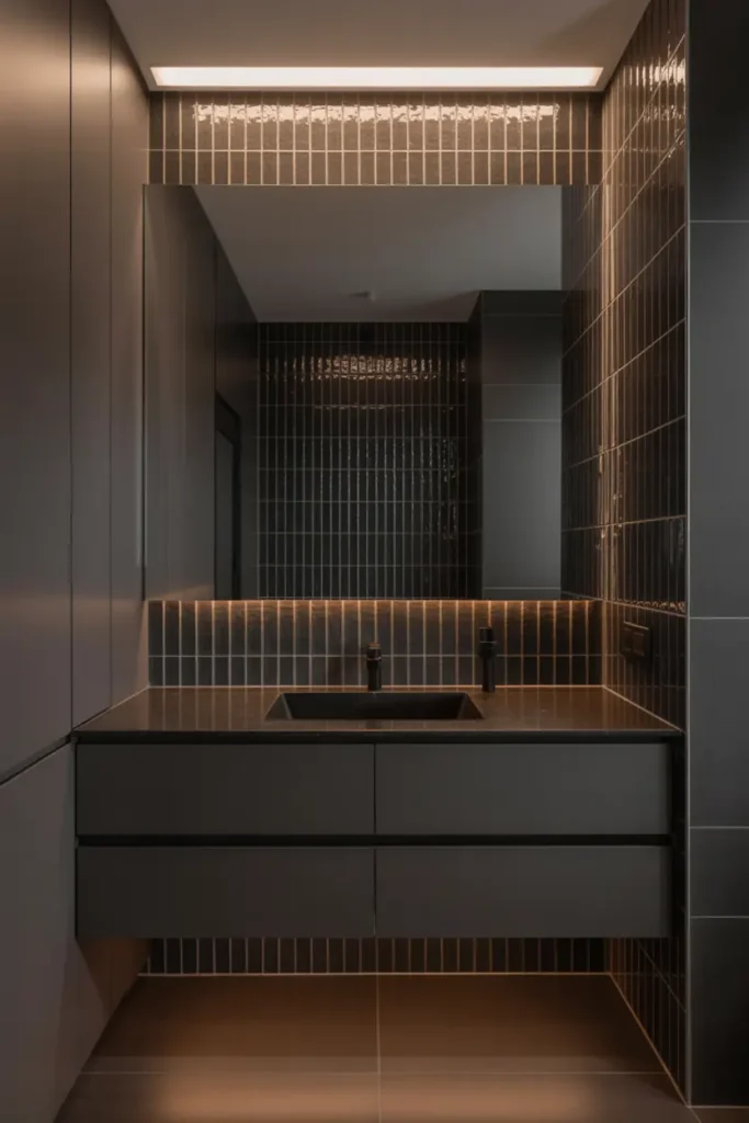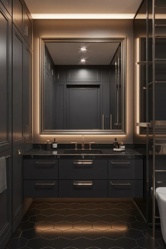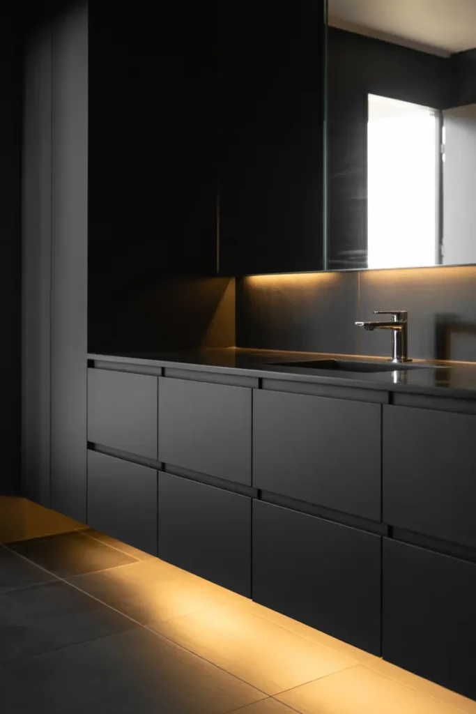 Under-cabinet lighting creates a soft glow that enhances the modern feel of black bathrooms.