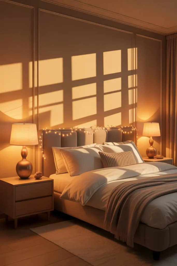 Using different light sources allows you to change the mood easily. Bright for daytime tasks and soft for evening relaxation. Warm lighting makes your bedroom feel peaceful, romantic, and beautifully cozy.