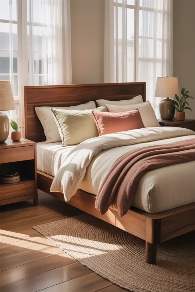 This combination creates a perfect blend of modern and cozy. Even small wooden details can make a big difference. Wood adds timeless charm while keeping the bedroom feeling natural, peaceful, and stylish.