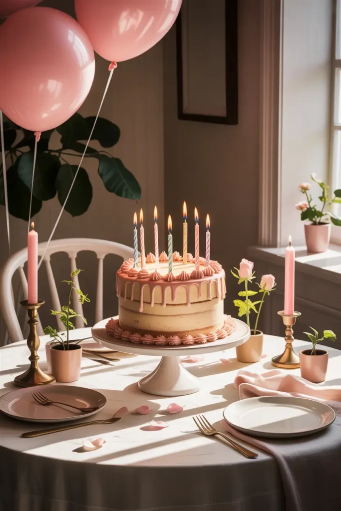 You don’t need many items. Keeping the table minimal makes the cake stand out. This idea works perfectly for small home parties and gives your celebration a classy, calm, and welcoming feel.