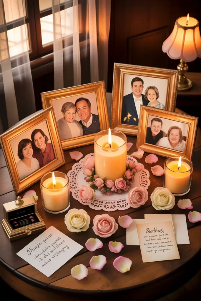 A photo memory table adds emotional beauty to your birthday celebration. Display childhood photos, family pictures, or special memories in simple frames. Guests love looking at them and sharing stories, which makes the party feel warm and meaningful.