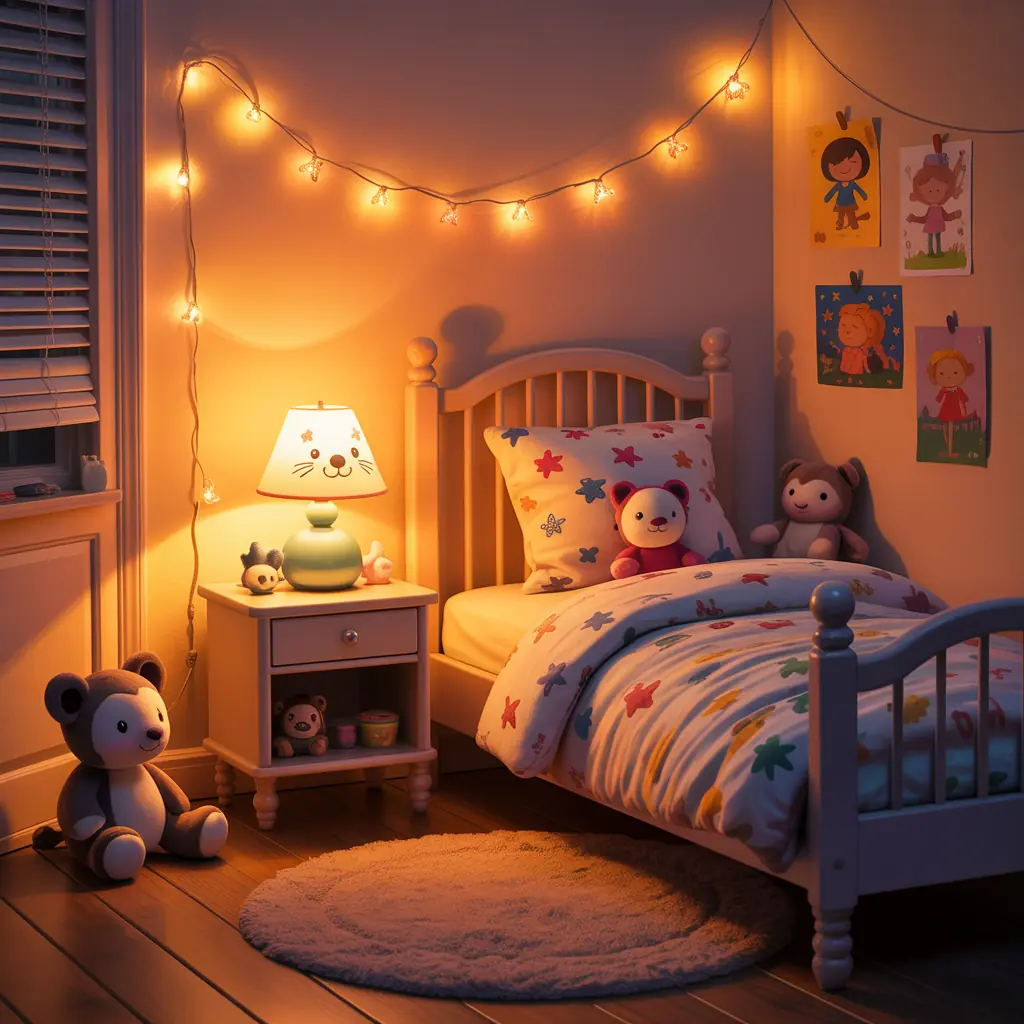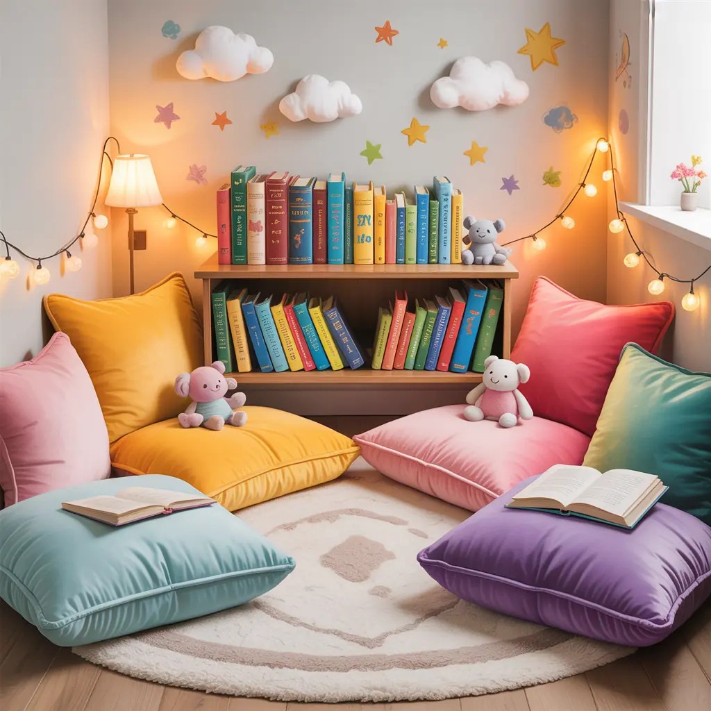 A cozy reading corner can be created with just a few cushions, a soft rug, and a small bookshelf. This little space becomes a calm and magical place where kids can read, relax, or daydream. It encourages good reading habits while also adding charm to the room. The warm lighting makes the corner feel safe and comforting.