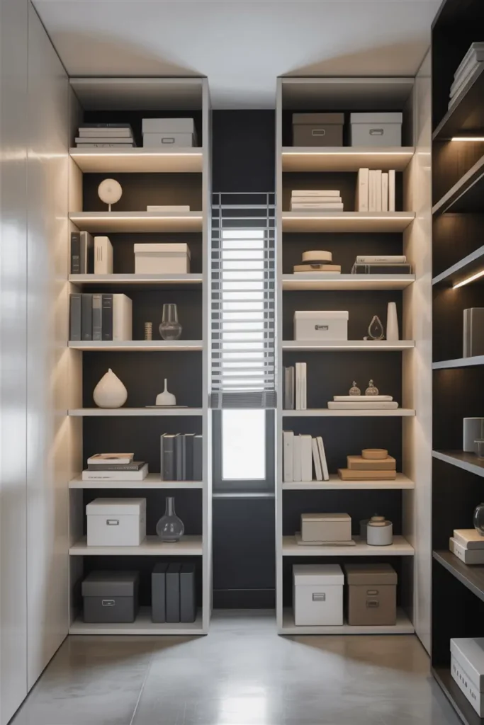 Using vertical space helps keep the floor open. Tall shelves, wall cabinets, or hanging storage make the room feel taller and more spacious.