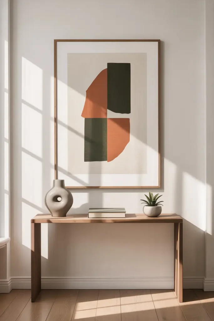 One large wall art piece looks better than many small frames in a small room. It keeps the wall clean and visually calm.