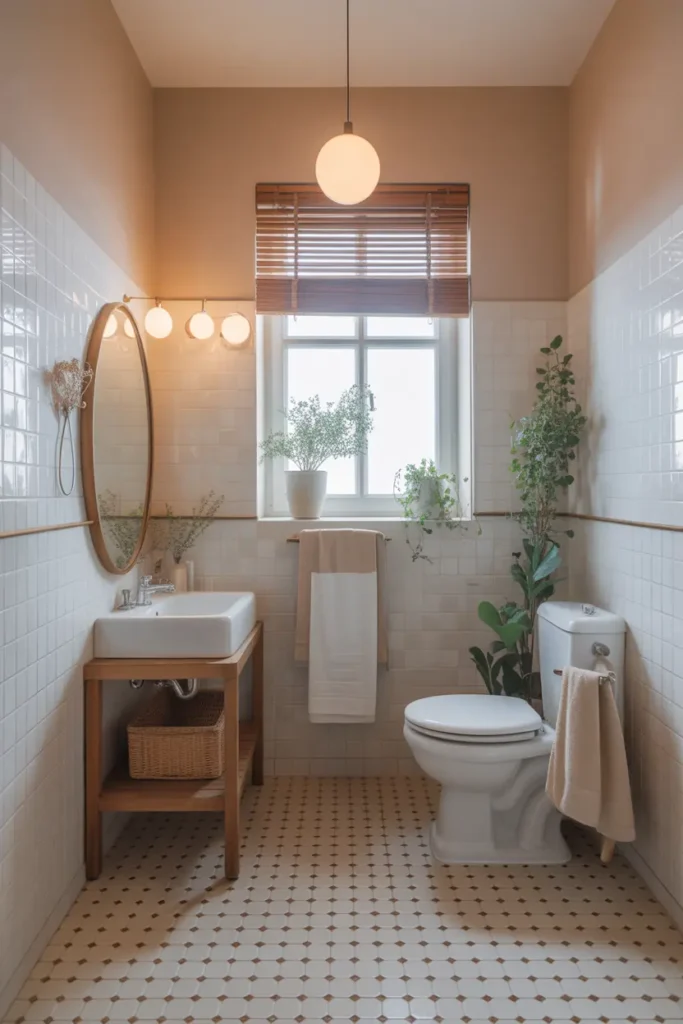 minimal small bathroom decor, clean surfaces, soft lighting, modern compact design