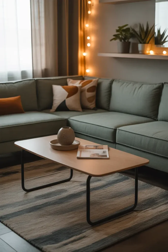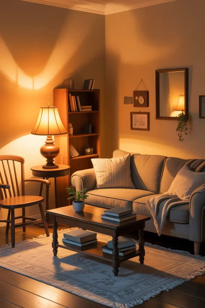 Soft lighting changes the mood of a living room instantly. A small table lamp or warm bulb makes the space feel cozy and expensive.