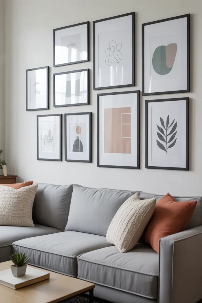 Simple wall frames add personality without spending much money. You can use printed quotes, abstract art, or family photos. This makes the living room feel warm and personal.