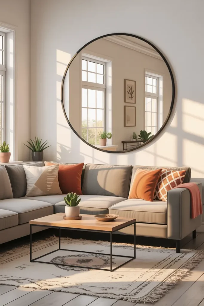 A mirror makes a small living room look brighter and larger. It reflects natural light and opens up the space beautifully. Even one mirror can change the whole atmosphere.