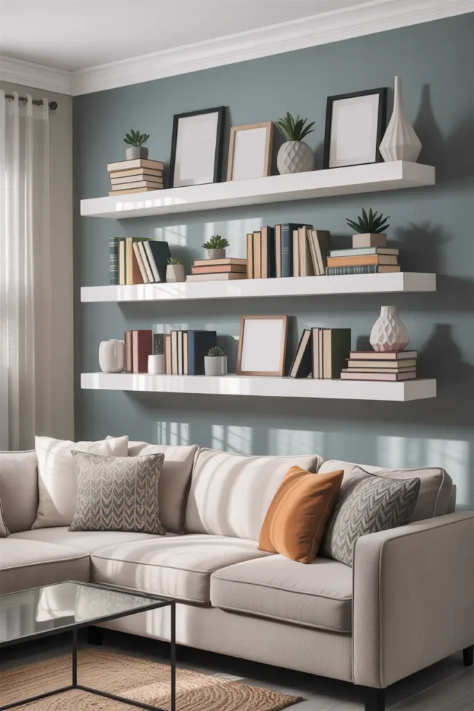 Floating shelves are budget-friendly and stylish. They give you storage and decoration at the same time. You can place books, frames, or small plants neatly.