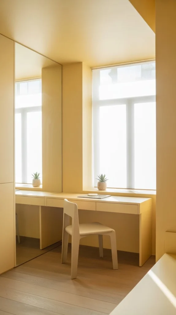 Organized tiny room with hidden storage, clean and modern minimal aesthetic