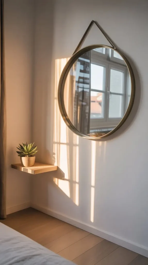 A photograph of a cozy, minimalist room featuring a circular brass-framed mirror mounted on a crisp white wall. Golden sunlight streams through an unseen window, creating geometric light patterns that dance across the mirror’s surface and cast warm reflections onto the surrounding wall. The room showcases clean Scandinavian design elements with light oak flooring, a single potted succulent on a floating shelf, and soft neutral tones throughout. The interplay of natural light and the mirror’s reflective surface creates a serene, airy atmosphere that emphasizes the space’s modern simplicity.