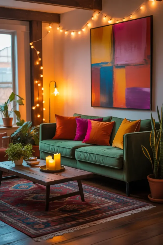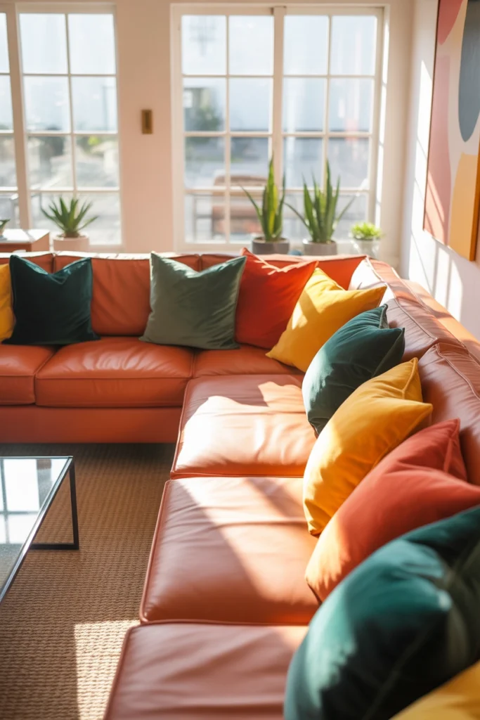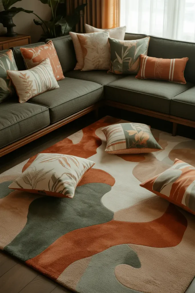 After setting your main color, start introducing secondary shades through cushions, throws, rugs, or small decor pieces. This is where the playful part comes in—but it should still feel controlled.
