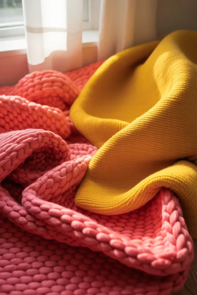 Color alone can sometimes feel flat. Texture is what makes it feel cozy. Velvet cushions, knitted throws, soft rugs, or even woven baskets help soften bold tones and make the space more inviting.