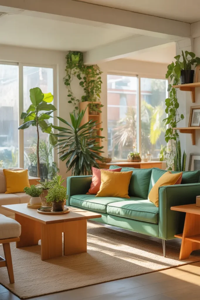 Plants, wooden furniture, or natural materials help ground a colorful room and prevent it from feeling too artificial. Greenery, in particular, works beautifully with almost any color palette and adds a fresh, calming touch.