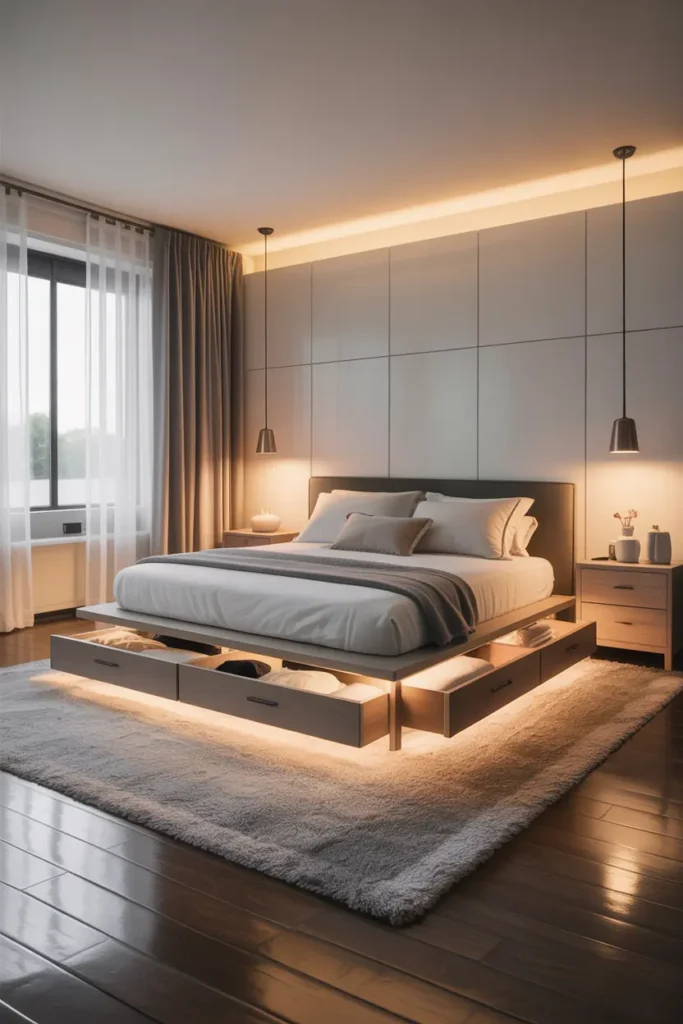 A well-proportioned bedroom isn’t just attractive—it’s practical. Make sure there’s enough space to open drawers, walk comfortably, and access storage. In tight spaces, consider under-bed storage or wall-mounted solutions to maximize function without sacrificing flow.