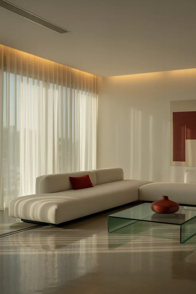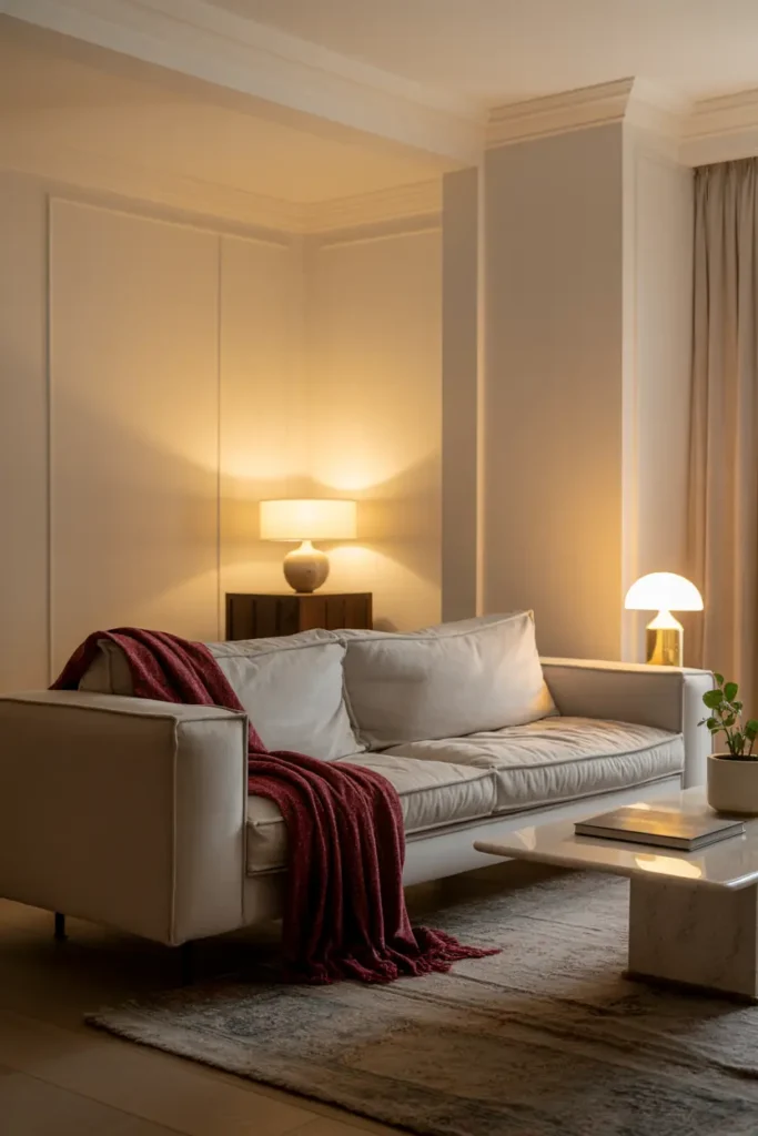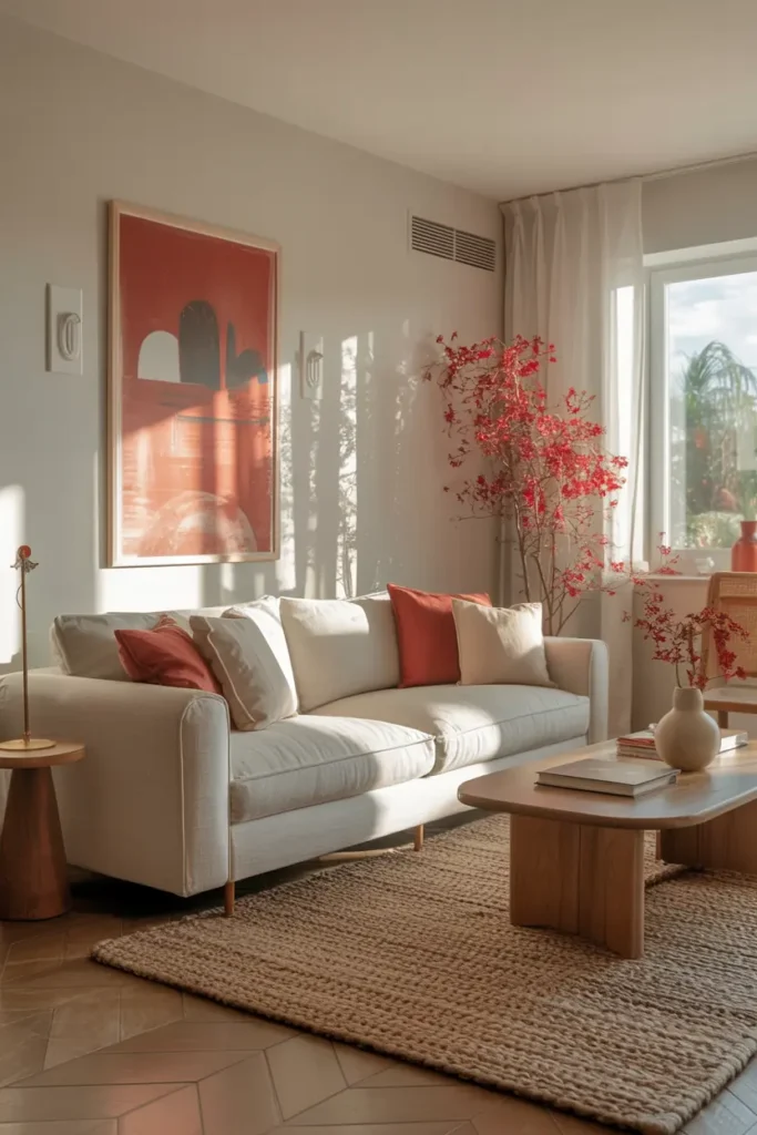 Before adding red, it’s important to build a foundation that feels calm and stable. Neutral tones like soft beige, warm white, or light grey create a background where red can stand out gently rather than aggressively. When the walls and main furniture stay neutral, the room feels open and relaxed.