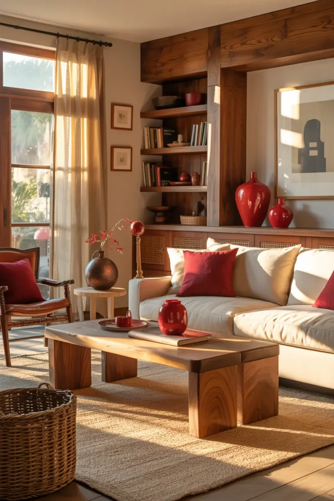 Red works best when it’s balanced with natural elements. Materials like wood, linen, or woven textures help soften its intensity and make the space feel more comfortable.