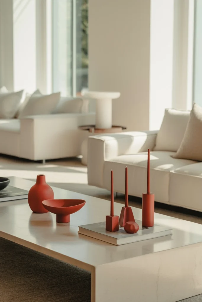 Instead of spreading red throughout the room, focus on a few small details. Items like vases, books, or trays can introduce color in a subtle and controlled way.