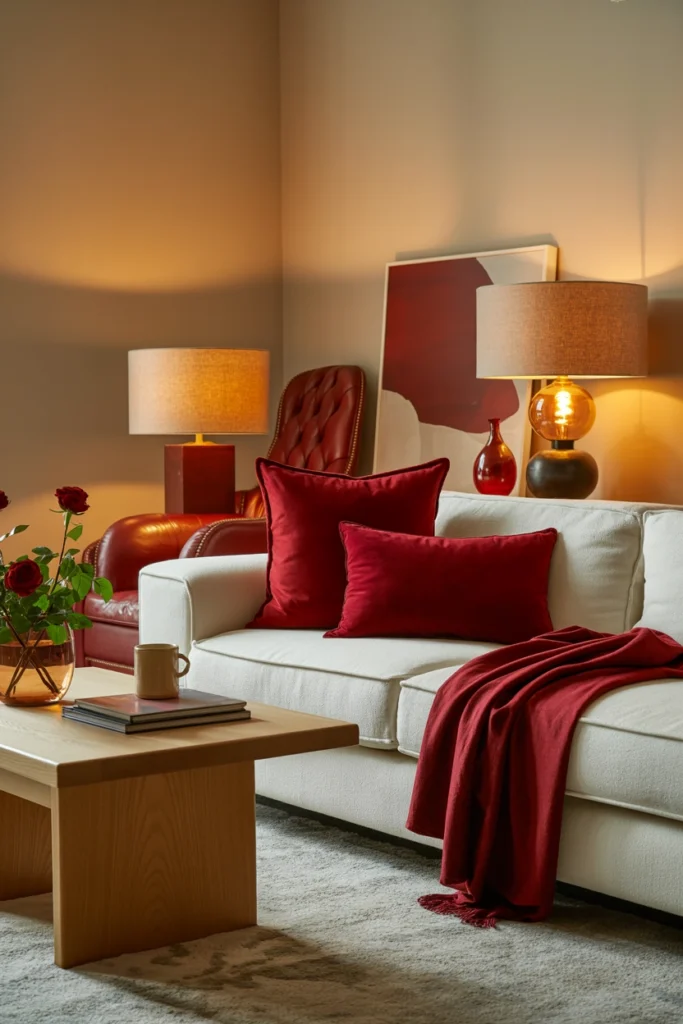 Pair Red Accents with Warm Lighting to Create a Soft Glow