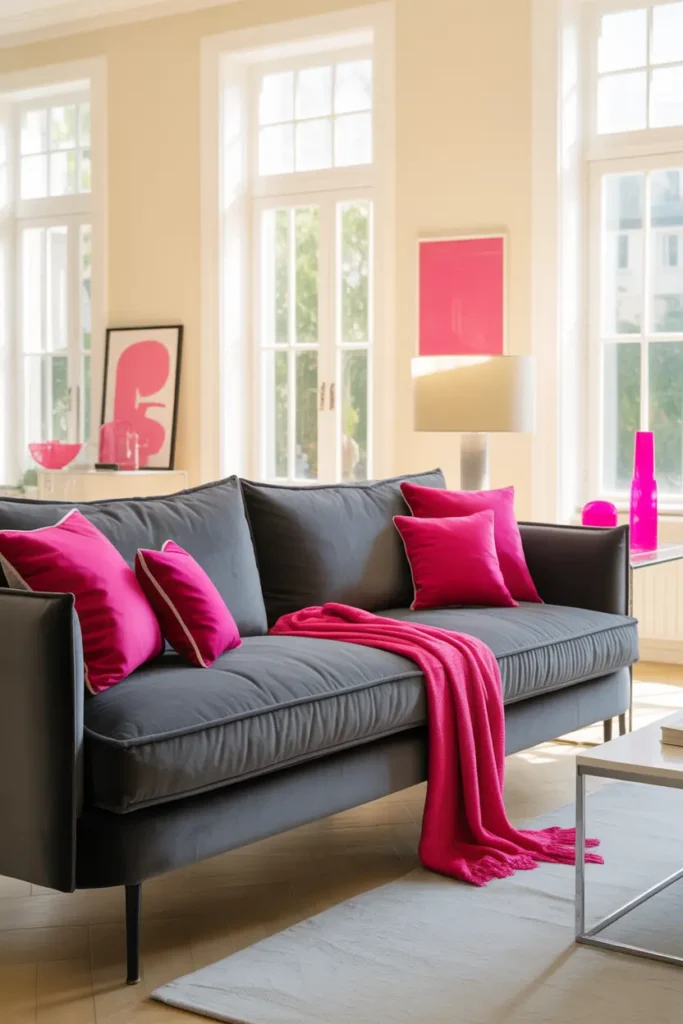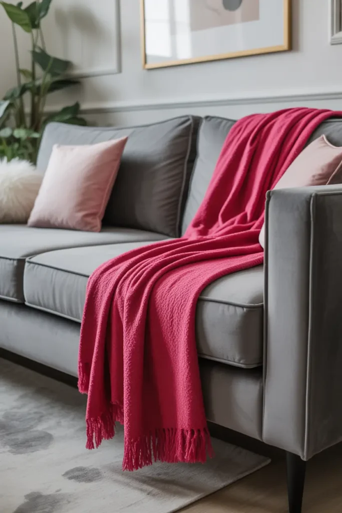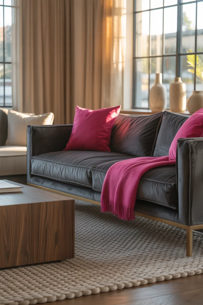 Sometimes, a single element is enough to change the entire mood of a room. A hot pink throw casually placed over a gray velvet couch adds a pop of color without requiring a full redesign. It feels effortless yet intentional, like a small detail that ties everything together.