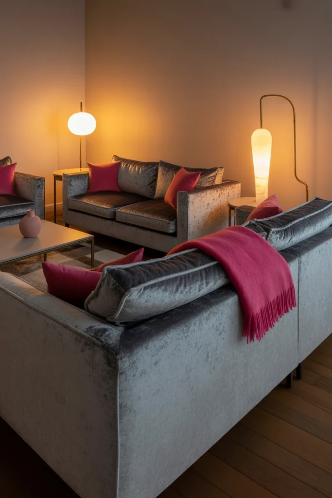 Lighting plays a quiet but powerful role in how colors are perceived. Soft, warm lighting enhances the richness of gray velvet while allowing hot pink accents to glow subtly rather than appear harsh.