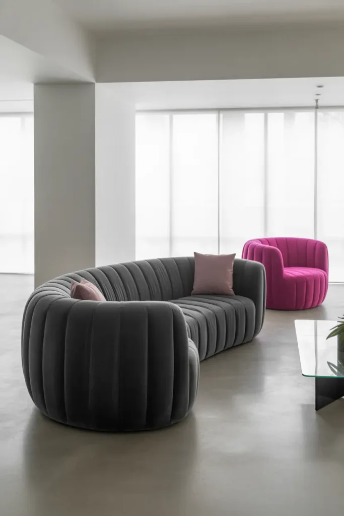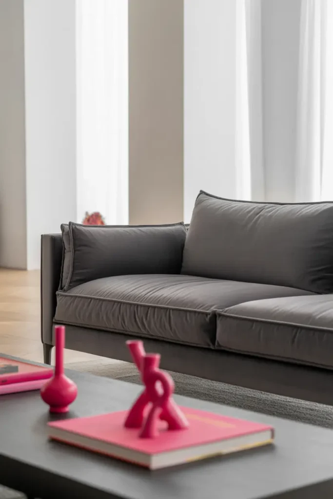 If you want to go slightly bolder, a hot pink accent chair can become a standout feature in your living room. When paired with a gray velvet sofa, it creates a striking contrast that feels modern and confident.