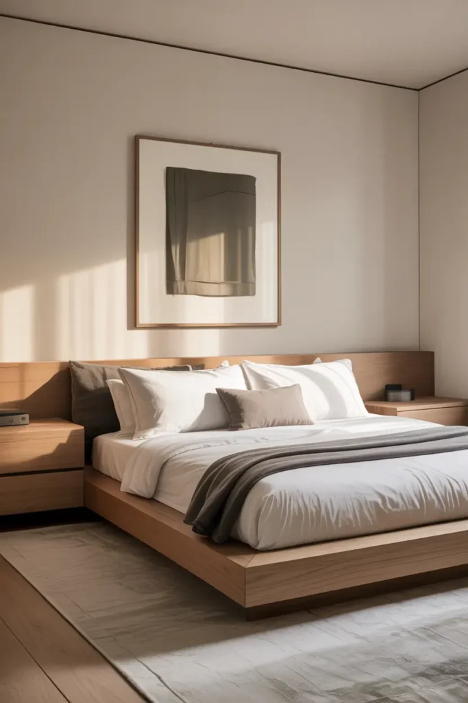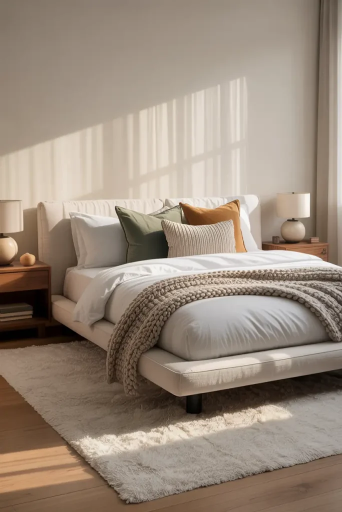 You can add depth with textured bedding or cushions. A neutral base keeps the bedroom timeless and easy to refresh with small decor changes anytime.