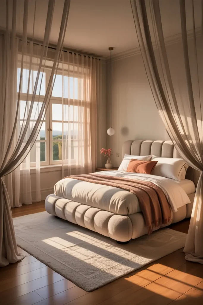 Curtains play a big role in bedroom design. Sheer or light-colored curtains allow natural light and make the room feel airy. Heavy curtains can make the space feel smaller.
