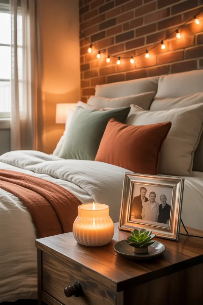 A small personal touch makes the bedroom feel warm and special. A framed photo, favorite book, or scented candle adds emotional comfort.