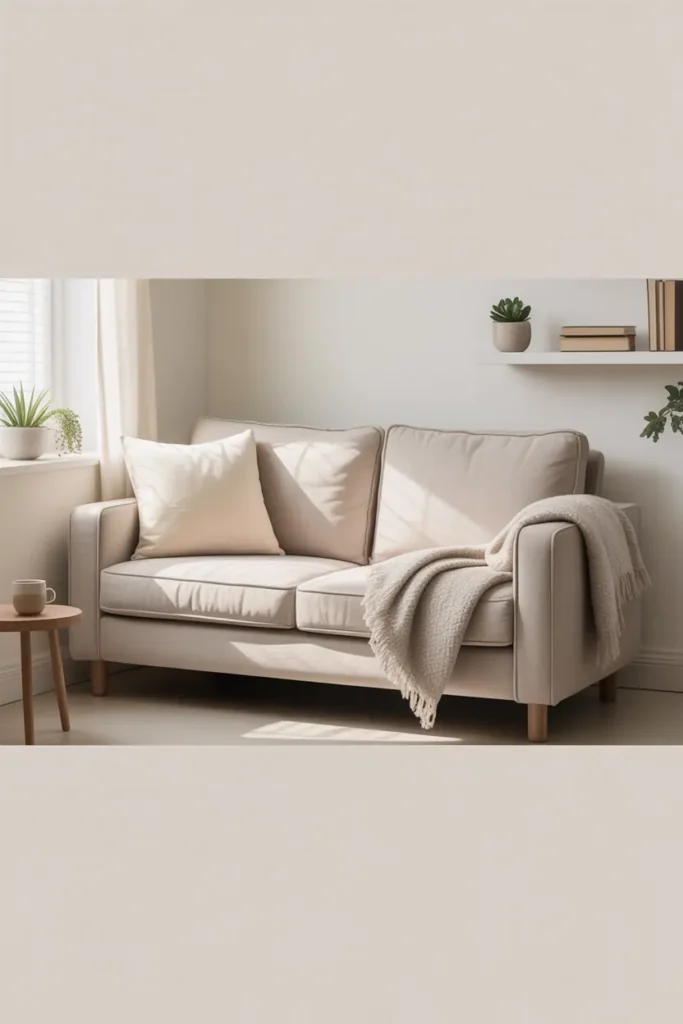 A compact sofa with slim arms is ideal for small modern homes. It gives comfort without taking too much space. Light fabric colors also help the room feel open and airy.
