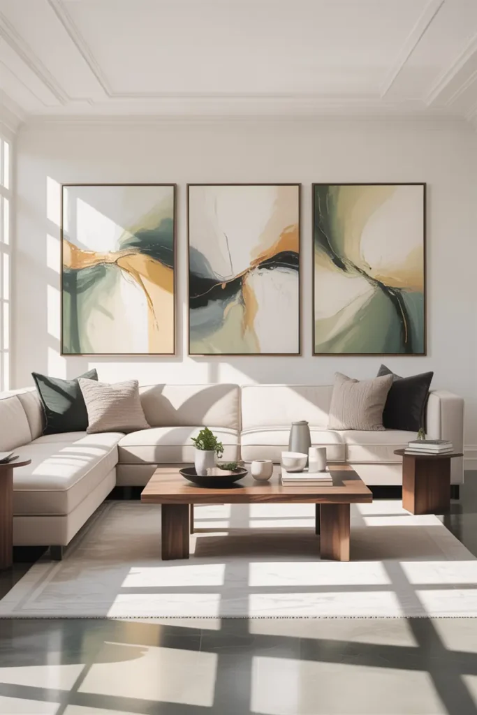 Minimal wall art keeps the living room stylish and clean. One large frame looks better than many small ones.