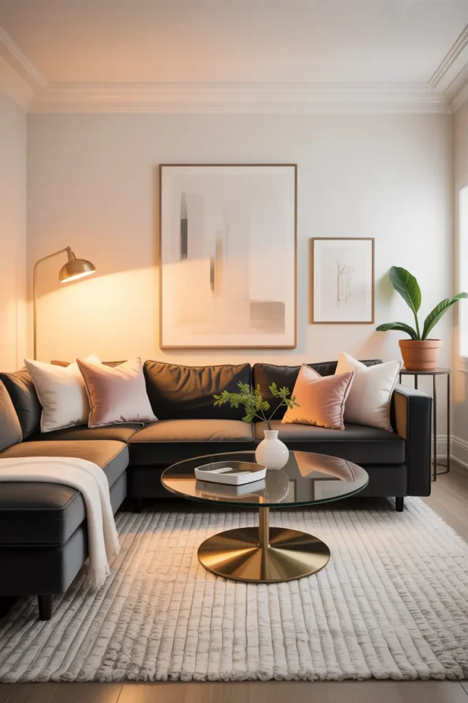 Add two cushions and a small side table. This setup keeps the living room cozy, functional, and modern.