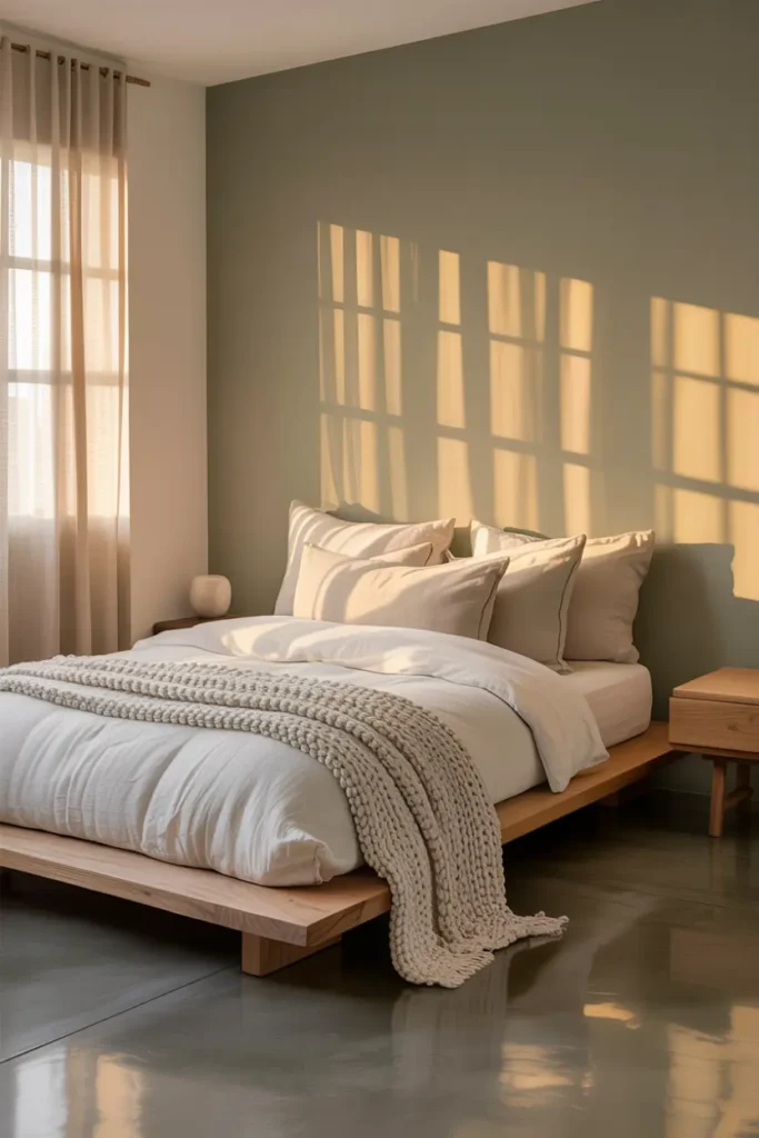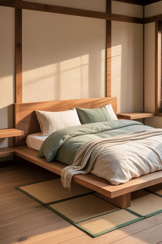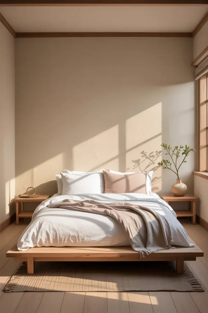 Soft textures play a big role in Japandi bedrooms. Linen sheets, cotton throws, and textured cushions add warmth without visual heaviness. This keeps the space cozy while staying minimal.