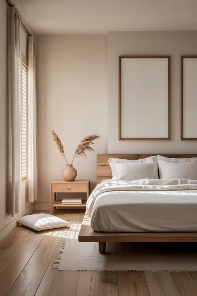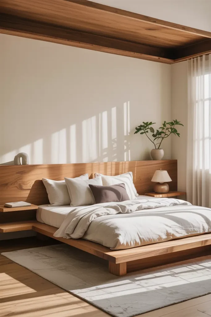 Natural wood adds warmth and balance to Japandi bedrooms. Light or medium wood tones bring an organic feel that softens modern minimalism. In small apartments, wood textures prevent the room from feeling cold or flat.