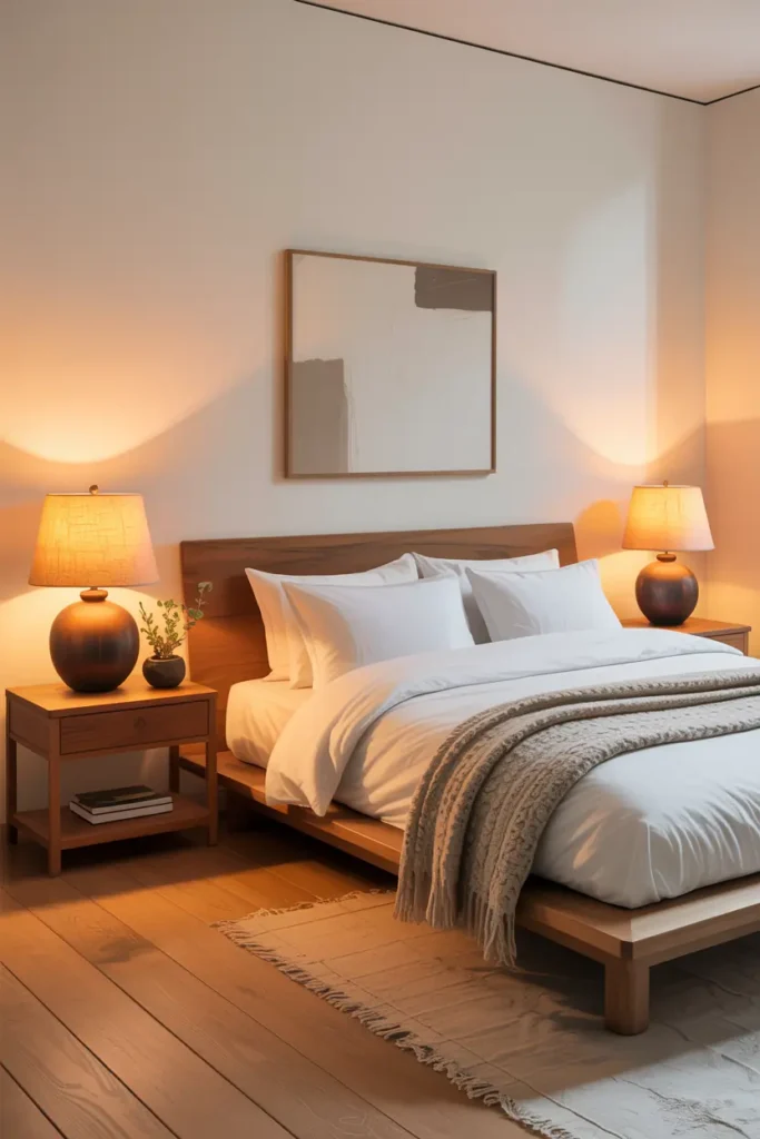Warm lighting creates a calming mood in Japandi bedrooms. Bedside lamps, paper lanterns, or soft wall lights provide gentle illumination. Bright overhead lights are usually avoided.